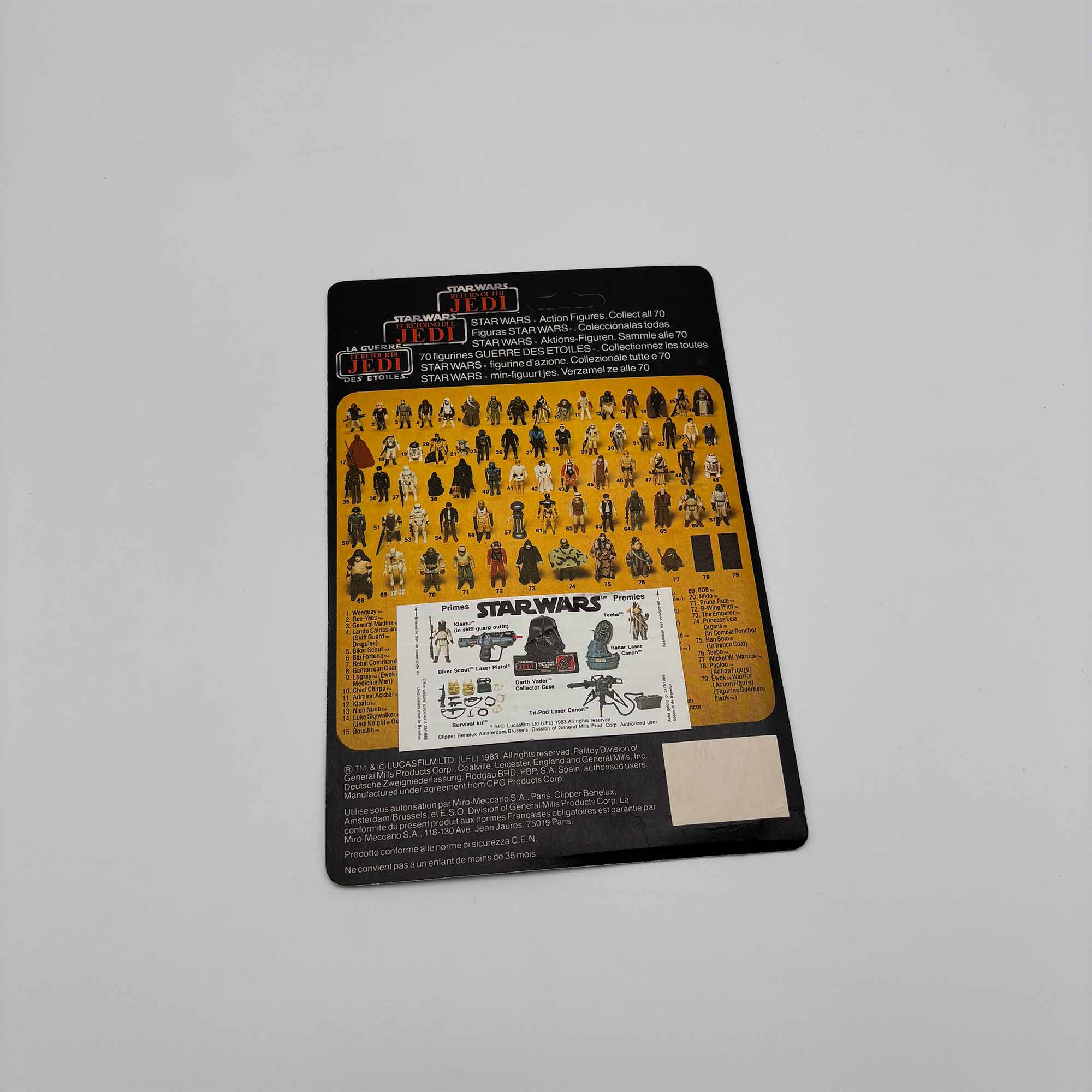 Card Backs zijn de originele kartonnen achterkanten van de verpakkingen van vintage Star Wars actiefiguren. Deze kaarten werden gebruikt bij Kenner-figuren uit de klassieke trilogie, zoals Luke Skywalker, Darth Vader, Han Solo, Princess Leia en vele anderen. De afbeeldingen, promoties en aanbiedingen op deze kaarten weerspiegelen de tijd waarin ze werden geproduceerd, vaak met iconische artwork en filmreferenties.